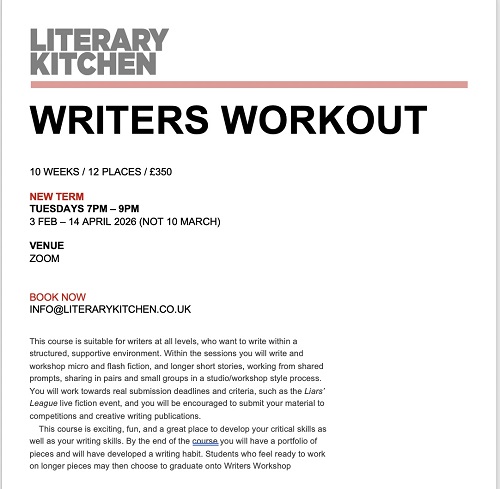 Literary Kitchen is offering four spaces on a Pay-What-You-Can basis for its new term of Writers Workout, a 10-week short course, suitable for writers at all levels, who want to write within a structured, supportive environment. Runs on Tuesdays at 7-9pm from February to April 2026. Read more...