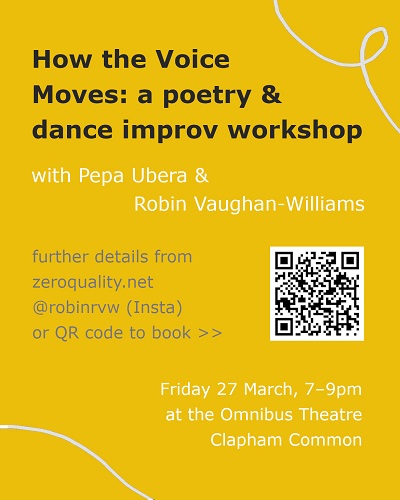 Join artist and choreographer Pepa Ubera and poet Robin Vaughan-Williams for a workshop exploring how the voice moves, how the body speaks.